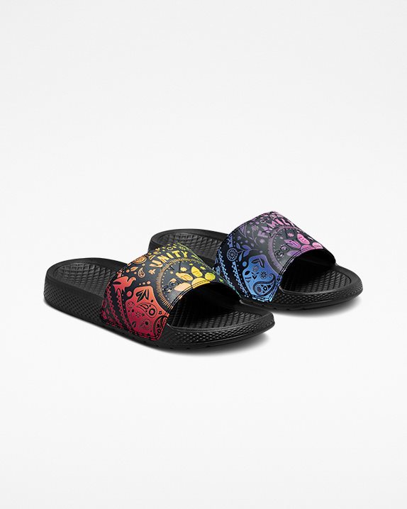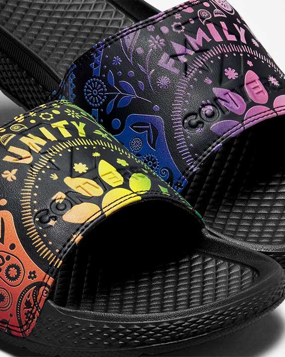 CONVERSE PRIDE.The classic, athletic slide sandal gets the Converse treatment to represent Pride. A Pride gradient bandana graphic appears on the straps, with unmistakable colors on each sandal. The Converse embossed wordmark logo and Star Chevron are on both straps, joined by the words Family + Unity to remind you that we are strongest when we stand together. The lightweight EVA foam outsole features that timeless, Chuck Taylor All Star diamond pattern, making this easy-on, easy-off style all you need this summer.DetailsSlip-on sandalEVA cushioning provides all-day supportRainbow-gradient bandana graphic on straps, with left and right designed in different colorsTraction diamond outsole with Star Chevron detailingFamily + Unity and Converse embossed wordmark on strapsLimited to 1 pair per customerChuck Taylor All Star OriginsCreated in 1917 as a non-skid basketball shoe, the All Star was originally promoted for its superior court performance by basketball mastermind Chuck Taylor. But over the decades, something incredible happened: The sneaker, with its timeless silhouette and unmistakable ankle patch, was organically adopted by rebels, artists, musicians, dreamers, thinkers and originals.