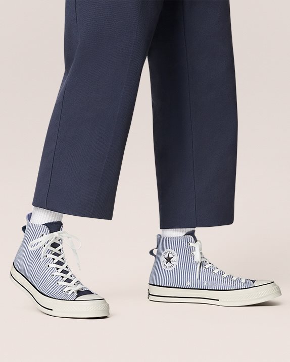HICKORY STRIPE.First worn by train engineers and railroad workers, this tight-knit stripe pattern is deeply rooted in American workwear heritage-and a perfect match for our vintage, '70s icon. The Converse Chuck 70 takes this classic look and updates it for today with an upper made from about 50% recycled cotton dyed fabric, a 100% recycled polyester star ankle patch, and a 100% recycled polyester heel loop to help with on and off. An OrthoLite sockliner and winged tongue stitching helps keep it comfortable, while a varnished egret midsole elevates this workwear-inspired look.?DetailsHigh-top shoe with about 50% recycled canvas upperWorkwear hickory stripe print stands out against a solid-coloured tongue100% recycled polyester star ankle patch and 100% recycled polyester heel loop put a twist on traditional materialsVarnished, egret midsole for a classic lookOrthoLite sockliner helps keep it comfortableChuck Taylor All Star 70 OriginsBy 1970, the Chuck had evolved to become the pinnacle of function and utility for sport, and was considered the best basketball sneaker ever. The Chuck 70 is built off of the original 1970s design, with premium materials and an extraordinary attention to detail. A shoe so rooted in tradition that it has its own instant history. That's the Chuck 70. It's not a shoe. It's the shoe.